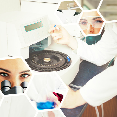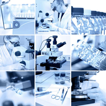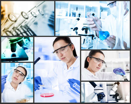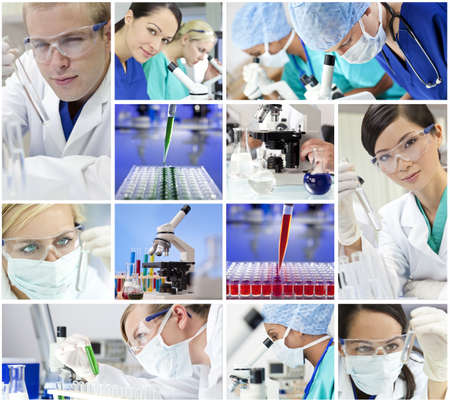 Montage of a medical or scientific research team men and women using microscopes and looking at test tubes in a laboratory