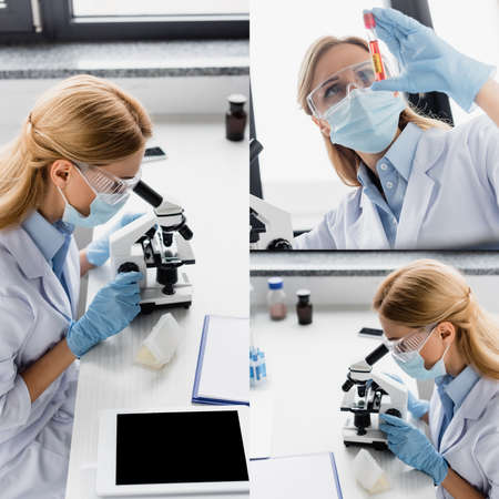 collage of scientist in latex gloves looking through microscope and holding test tube with sample