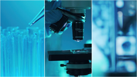 Scientists perform cell culture experiments, collage