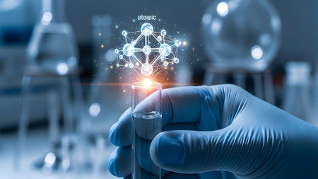 A gloved hand holds a test tube with a glowing atomic structure and sparks against a blurred lab...