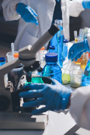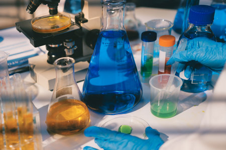Scientist with blue gloves experimenting with colorful liquids in glass flasks in a lab. Concept of science, chemistry, research, experiment and analysis.