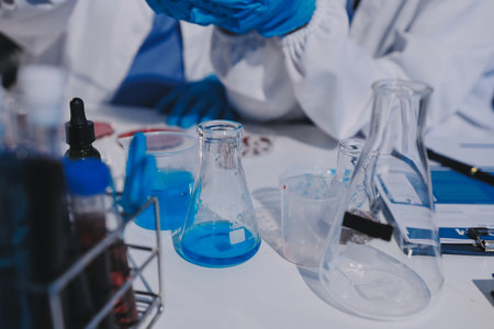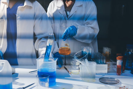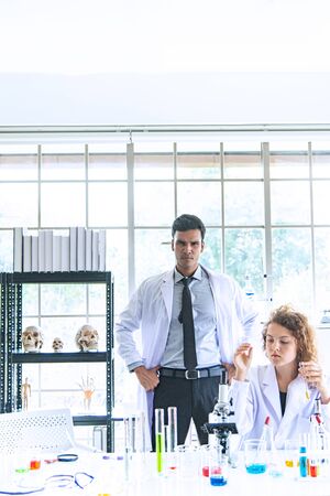 Scientist working putting medical chemicals sample in test tube at lab together