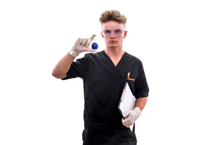 Male scientist wearing blue safety glasses and glove isolated with white background