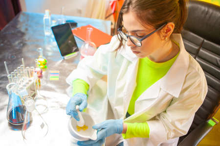 Scientist is engaged in laboratory research. Lab assistant examines test tube. Woman biologist her desk. Laboratory research in field of chemistry. Woman conducting laboratory research with reagents
