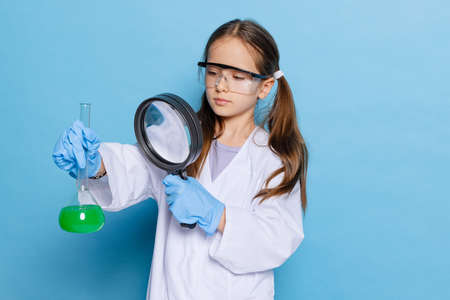 Portrait of little school girl, kid in white big gown as chemist, scientist chemical equipment, fluid in laboratory isolated on blue background