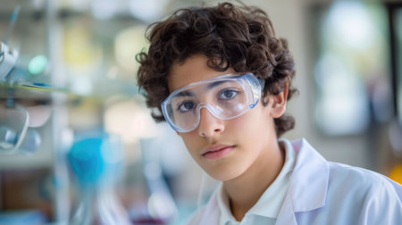 The close up picture of the young hispanic scientist student looking at the camera while wearing the lab coat and safety goggles in the laboratory and testing on the experiment inside the lab. AIG43.