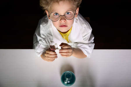 Serious little boy in white uniform and glasses conducts chemical experiments in laboratory. Young scientist is engaged in science, poses for camera in laboratory on black background, photo from above