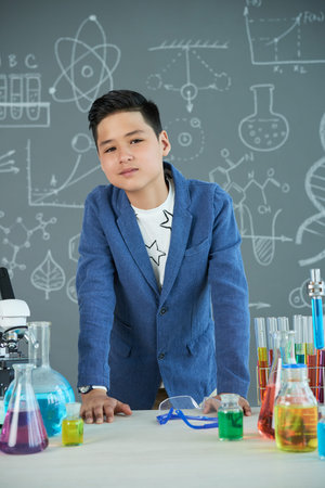 Smart boy scientist making chemical experiments in the laboratory. Educational concept.