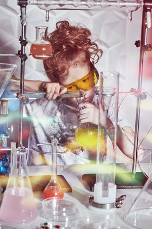 Scientific researches and children. A funny puzzled little boy with glasses and matted hair stands thoughtfully among flasks and test-tubes after experiments in a chemical laboratory. Education.