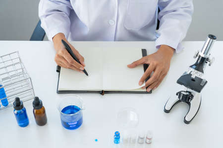 Biochemistry laboratory research, Chemist is analyzing sample in laboratory with equipment and science experiments glassware containing chemical liquid.