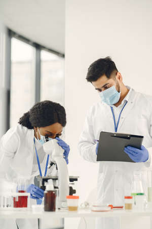 Two young men scientist using a microscope for looking solution in corona virus Laboratory in a chemical laboratory room.