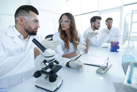 Doctor in the laboratory analyzes samples under a microscope. Pharmaceutical treatment concept.
