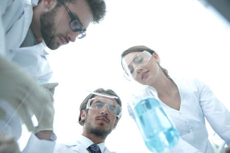 group of scientists working with liquids in the laboratory