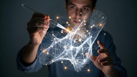 Researcher engages with virtual molecular models using advanced technology in a modern laboratory setting.