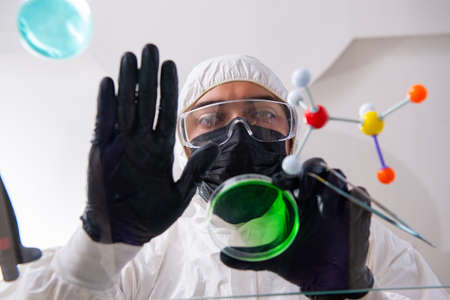 Development chemical weapons. Virologist creates fighting viruses. Concept creation of viruses for conduct of war. Creation of chemical weapons in laboratory. Chemist in chemical protection uniform
