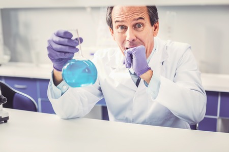 Unexpected results. Professional skillful chemist feeling surprised after unexpected results of sensational discovery
