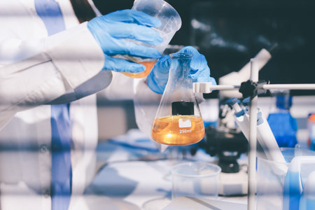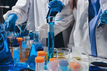 Scientist with blue gloves experimenting with colorful liquids in glass flasks in a lab. Concept of science, chemistry, research, experiment and analysis.
