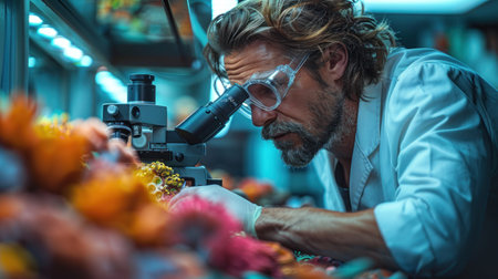 A biologist studying marine life in a laboratory, examining samples under a microscope with colorful corals and sea creatures in the background