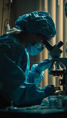 Physician examining biological samples under microscope in a medical research laboratory
