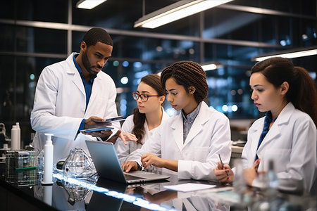 A group of diverse scientists collaborates in a cutting-edge lab, focused on complex data analysis and discussions.