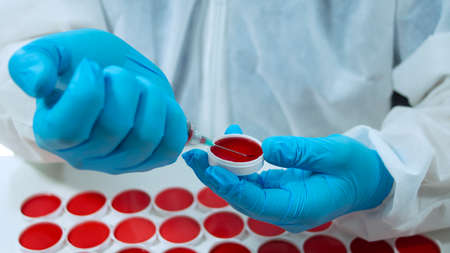 Close up of a doctor wearing blue gloves holding a syringe with his hands, taking a sample of red liquid from a round plastic container with a group of round red clinical sample in the background