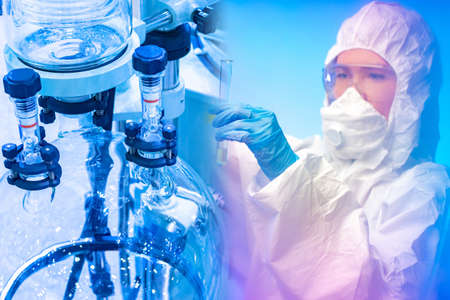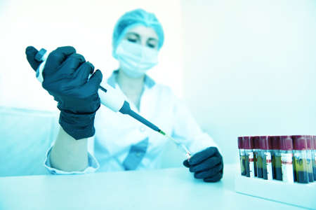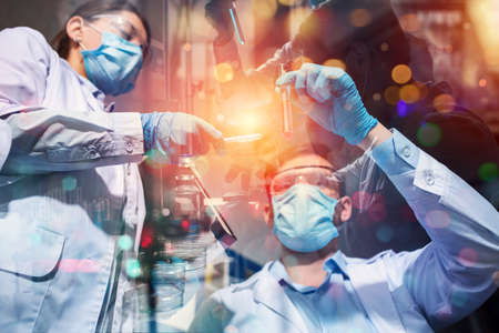 Laboratory assistants are investigating chemical reactions, medical scientists, chemical researchers, chemical experiments and disease testing from patient blood samples. Medicine and research concept