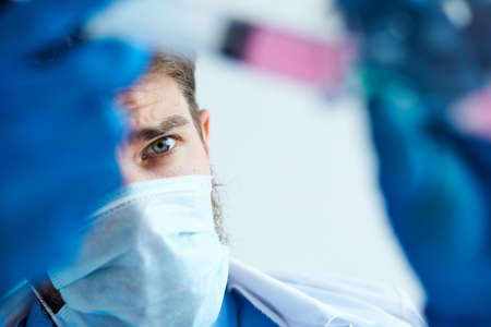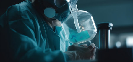 A doctor wearing protective glasses and a medical mask and wearing blue gloves draws green liquid from a test tube