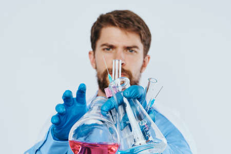 Serious clinician studies with tools in laboratory and holding flask. adult man standing on black background at table with microscope