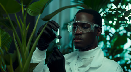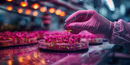 Scientist in a protective gloves cultivating genetically modified plants in a futuristic laboratory. Advanced biotechnology.