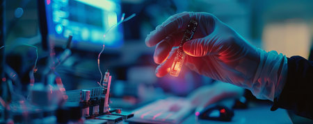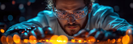 The male scientist, energetic and creative, is deeply immersed in a futuristic robotics experiment, illuminated by vibrant colors and glowing AI components in a cutting-edge lab, banner