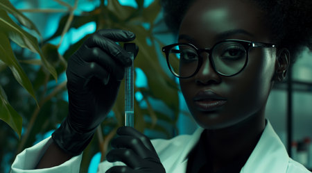 A scientist wearing white gloves carefully examines vibrant plant samples inside a test tube, showcasing a blend of nature and research in a lush laboratory environment.
