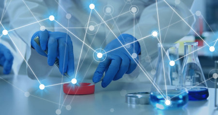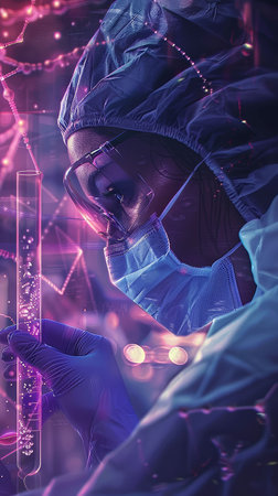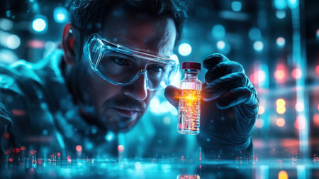 A focused scientist conducts research in a modern laboratory, handling petri dishes while digital biological data visualizes complex interactions, symbolizing health innovation.