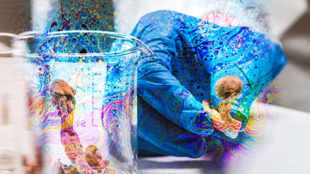 Magic Mushrooms with psychedelic colors in laboratory. Psilocybin science and research. Person examining fungi.