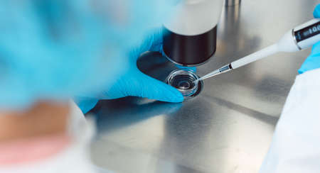 Woman scientist working with pipette in laboratory dripping egg cell in solution