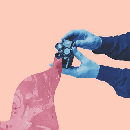 Contemporary art collage. Colorful image of retro photo camera in human hands isolated over peach color background