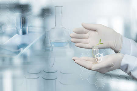 close-up of a male researcher conducting experiments in a modern laboratory with plant and dropper, gmo grown