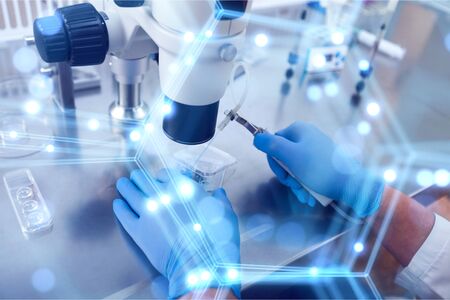 Closeup scientist hand using microscope in laboratory. Unrecognizable researcher working with coronavirus samples. Female doctor in glove doing experiment with covid-19 vaccine. Health care concept