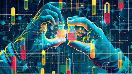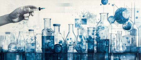 A hand holds a syringe amid blue and white lab glass, showing the blend of art deco style with medical research and creativity.