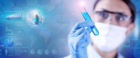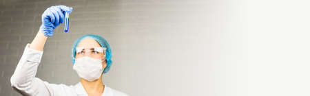 Banner Investigator checking test tubes. Woman wears protective goggles copy space