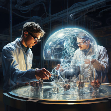 Medical professional in a dimly lit lab, focusing on a floating holographic projection of a brain