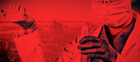 Vaccine development. Covid-19 immunization. Inoculation risk. Shocked female doctor in ppe goggles face mask gloves testing vial dose in hand in red neon light on dark blur blue copy space banner.