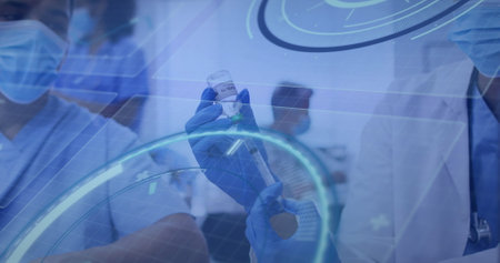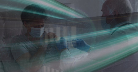 Image of data processing over diverse doctors with face masks vaccinating. medical and healthcare services during pandemic concept digitally generated image.