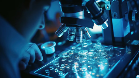 A close-up view of a microscope lens focused on a sample. Technology, science, healthcare, education concept background. Generative AI