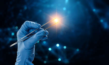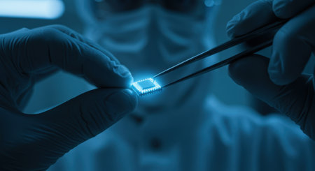 Close up of a scientist holding a glowing microchip with tweezers, showcasing advanced technology in a laboratory setting, emphasizing precision and innovation in electronics.
