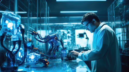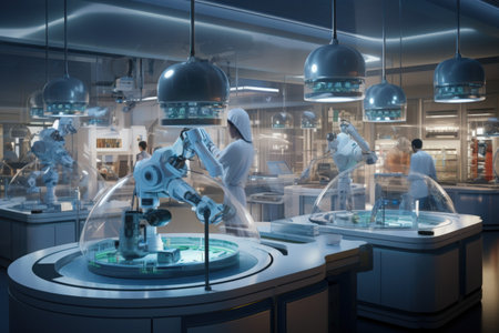 Advanced robotic technology in a futuristic lab highlights automated systems and innovative research processes, showing the future of science and technology