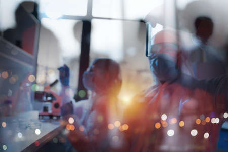 Professional team of scientists is working on a new vaccine in a modern scientific research laboratory. Genetic engineer workplace. Future technology and science concept.