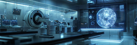 A futuristic medical laboratory with high-tech equipment, featuring an AI-powered scanner analyzing patient data on a large screen.