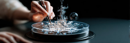 A person meticulously constructs a detailed holographic model using fine tools, showing innovation and creativity in a darkened workspace.