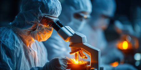 Medical experts in protective gear study viruses through microscopes to enhance disease control measures within a lab environment.