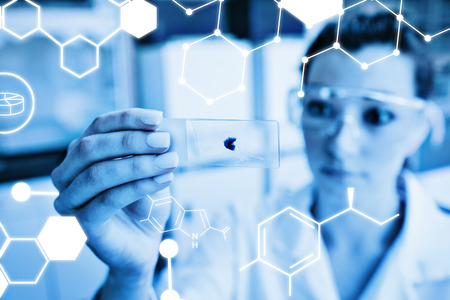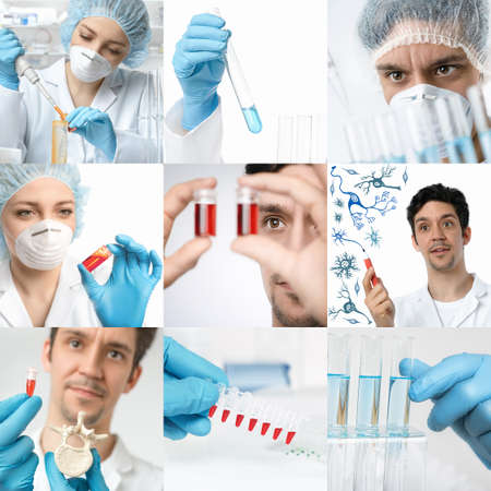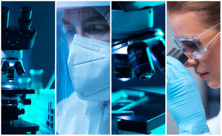 Scientist working with microscope and test tubes in laboratory. Double exposure